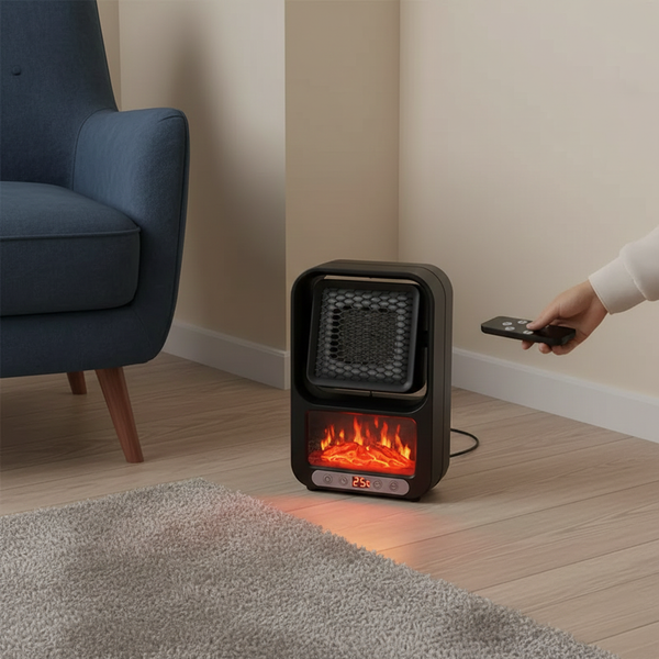 Îți aduce rapid căldură exact unde stai, iar efectul de șemineu creează o atmosferă cozy în serile reci. Este portabil și ajustabil, cu termostat, timer și telecomandă pentru control simplu din fotoliu.